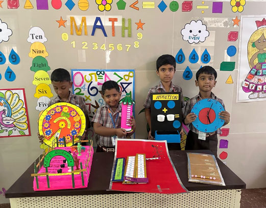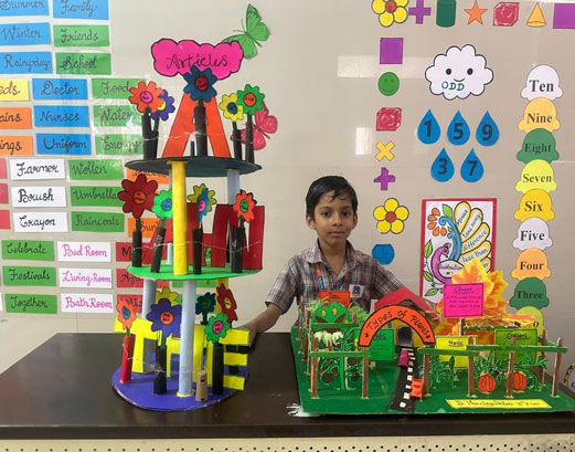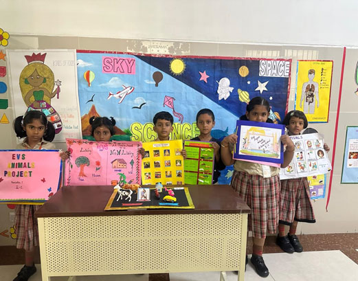 ✨ Models and Charts: From colorful Math displays illustrating numbers and shapes to detailed EVS models demonstrating habitats of wild and domestic animals, and beautiful charts depicting stories or grammar concepts in English and Hindi, the variety is impressive.