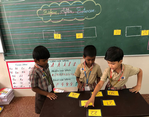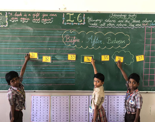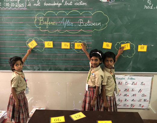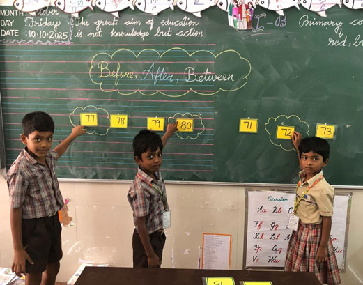 🌸 The Three-Card Game: Small groups worked with number flashcards. The teacher pasted cards on the board (e.g., 71 and 72), and the students had to quickly find the missing "Between" card (73) to complete the sequence. This fostered quick thinking and teamwork.