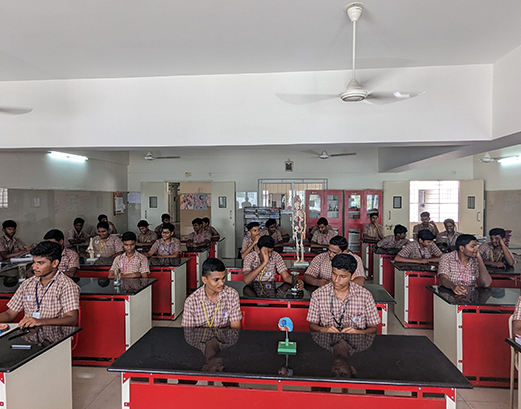 Biology Lab is ventilated and meets the demands of the advancement.It has sufficient number of preserved specimens, test tubes, slides, physiological apparatus, Charts, Microscope and needed chemical solutions for the experiments and various models to make the students learn better practically.